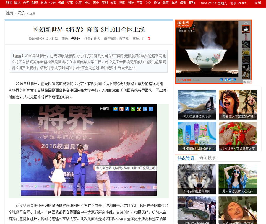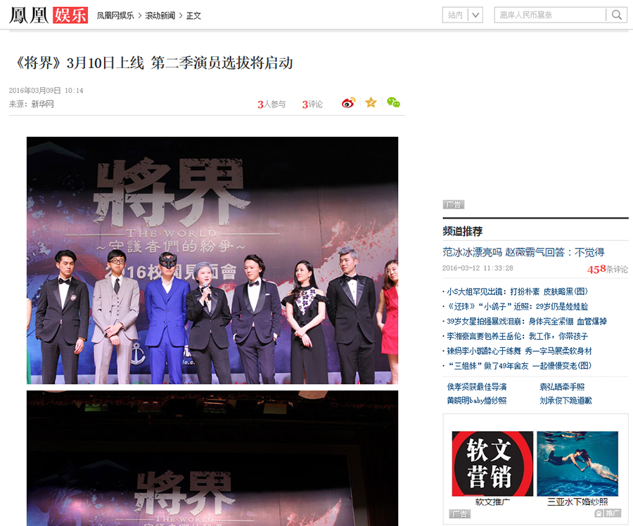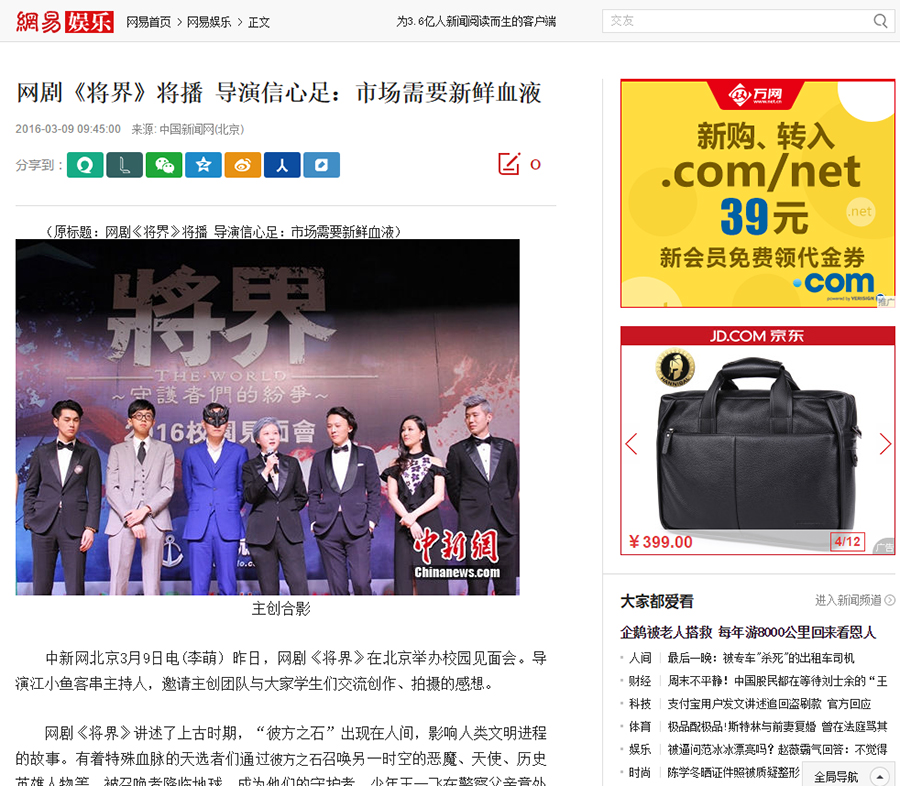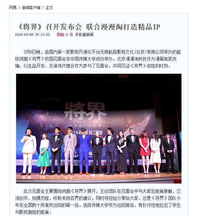 《將界》是一部網(wǎng)絡(luò)劇,主要是網(wǎng)絡(luò)上宣傳,包括發(fā)布會(huì)全部委托給我們負(fù)責(zé)媒體邀約這塊。以及網(wǎng)絡(luò)宣傳這塊??傆?jì)執(zhí)行了廣州 中國傳媒大學(xué)等不同地方的3場發(fā)布會(huì)。邀請(qǐng)數(shù)十家網(wǎng)媒報(bào)……
