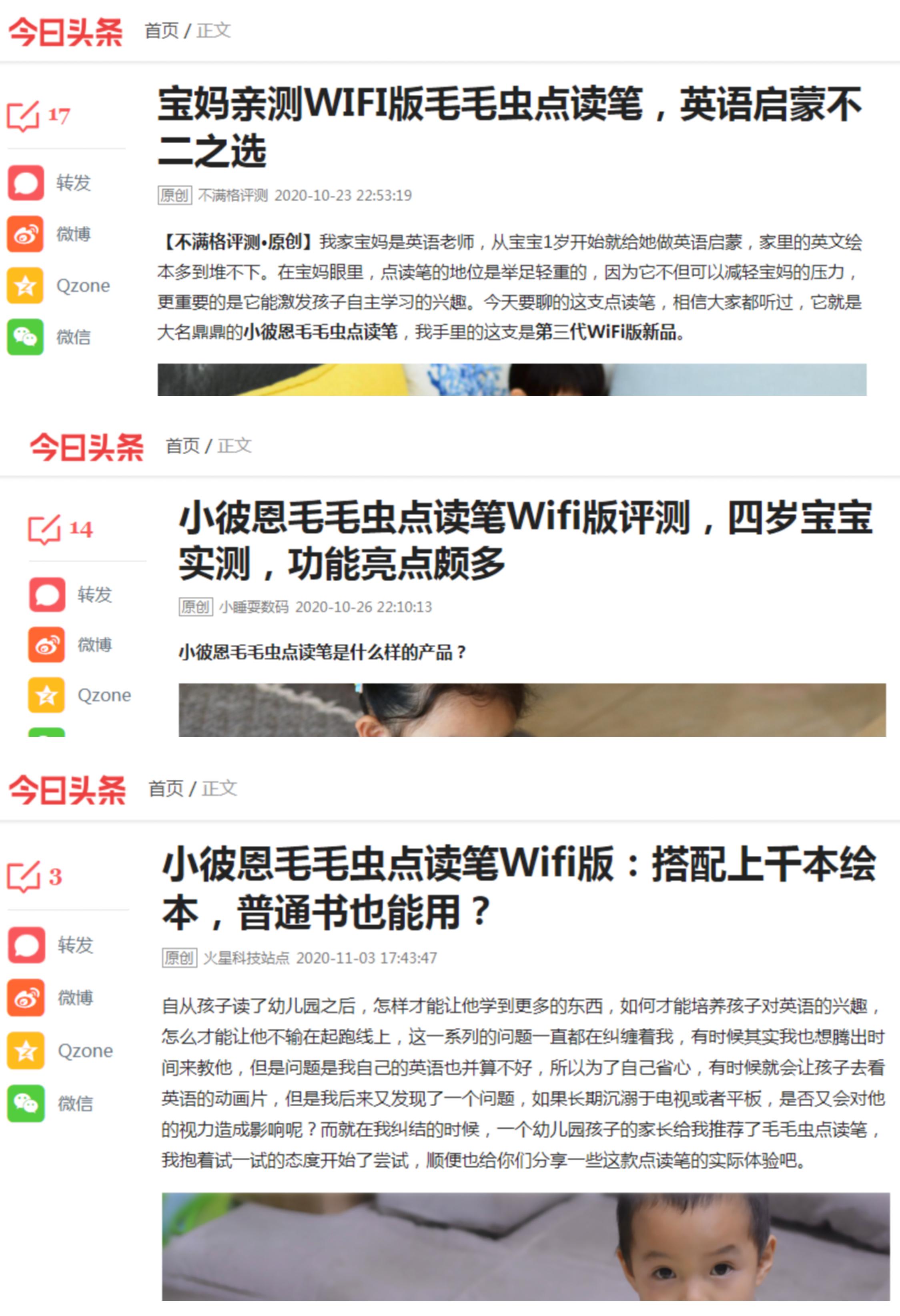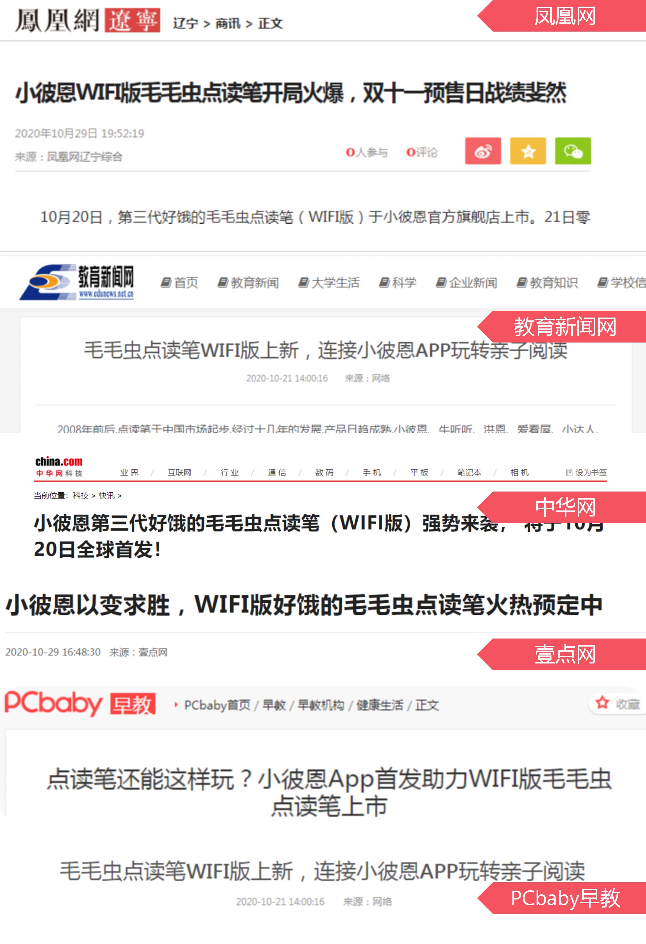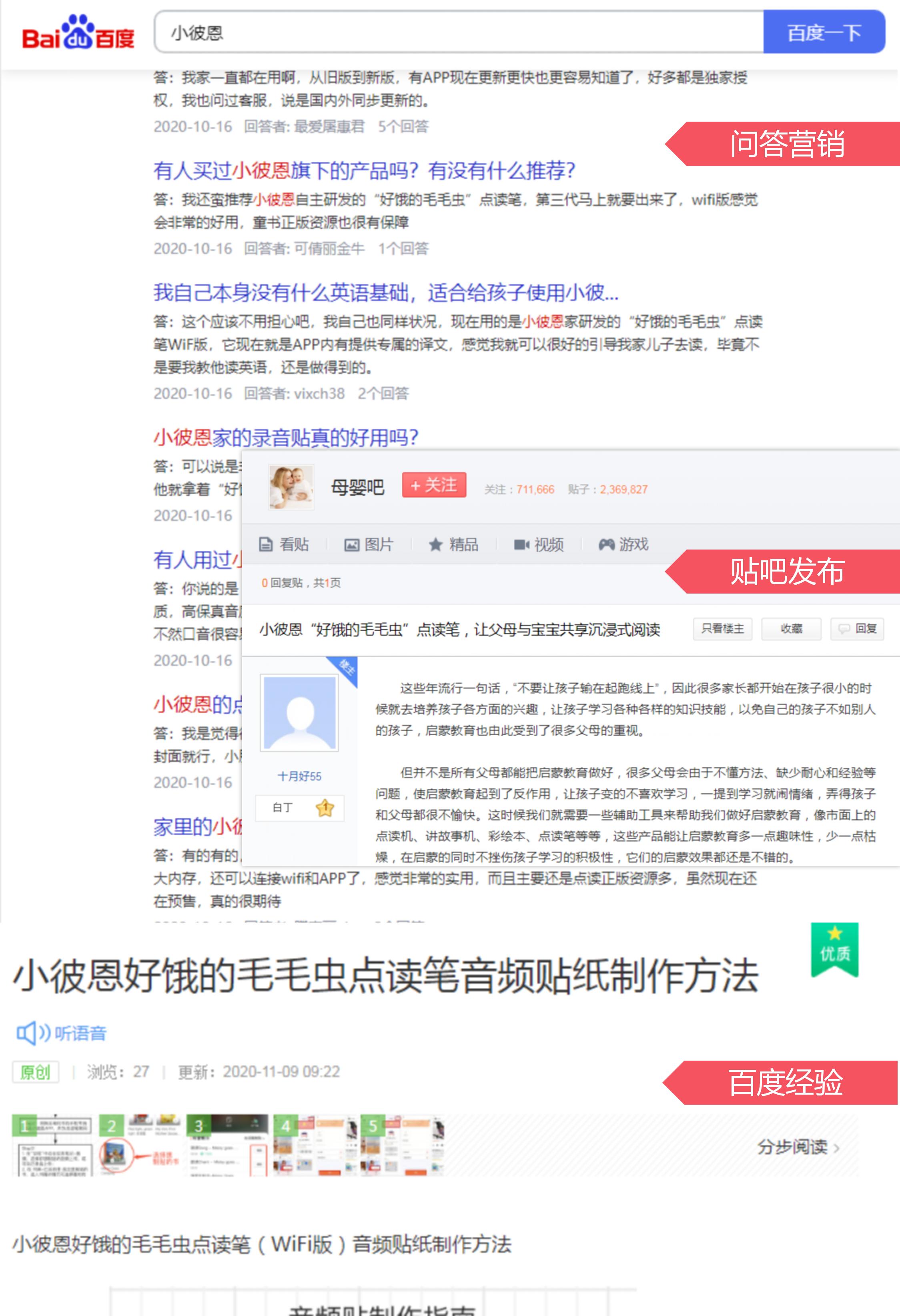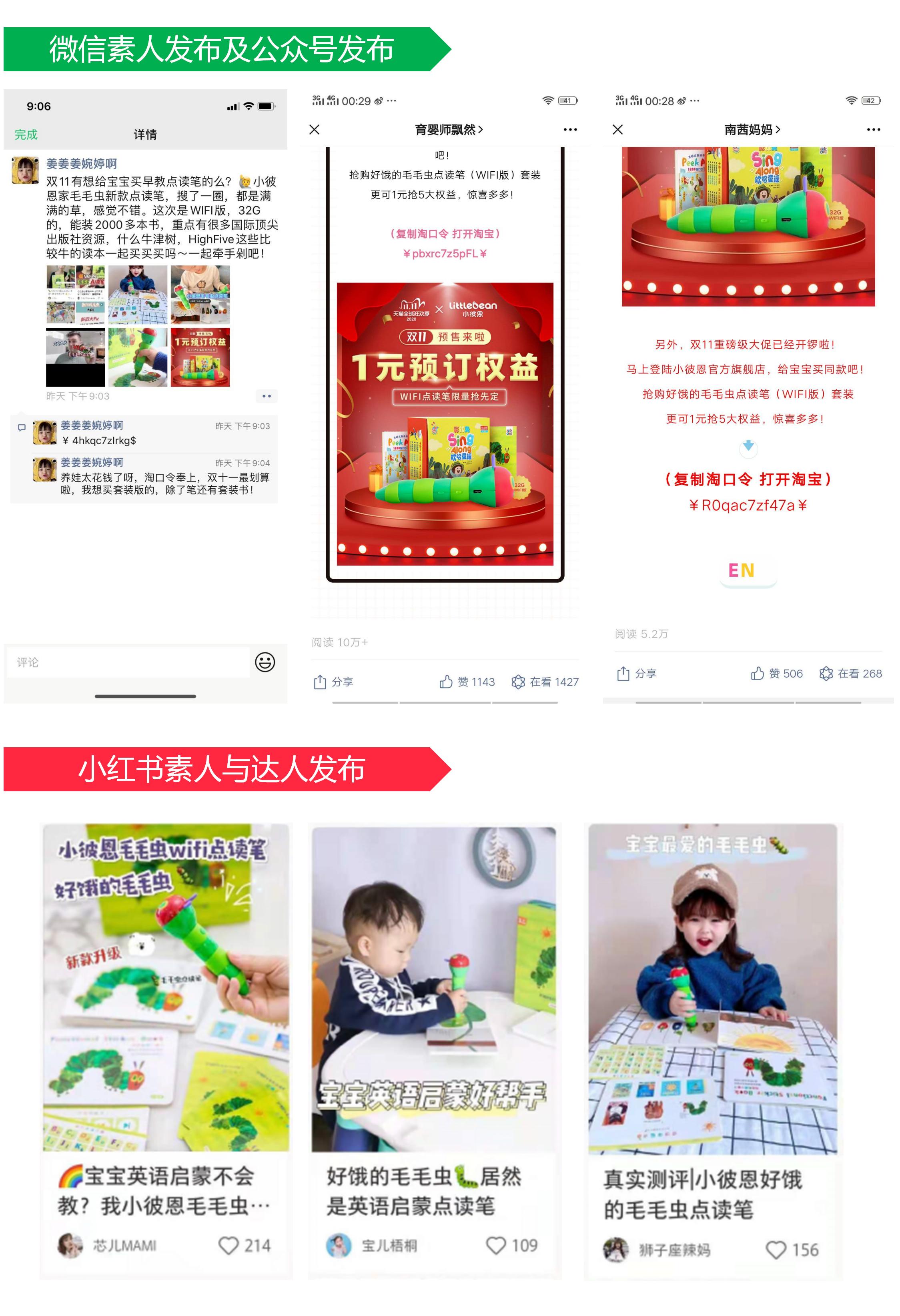 - ? 推廣效果 : 1.品牌得到相應曝光:小彼恩品牌及新品“好餓的毛毛蟲WiFi版”在媒體、口碑、論壇優(yōu)化推廣,值得買、知乎產(chǎn)品測評及小紅書、抖音種草領域達到良好的曝光,便于消費者對品牌產(chǎn)生認知和記憶。