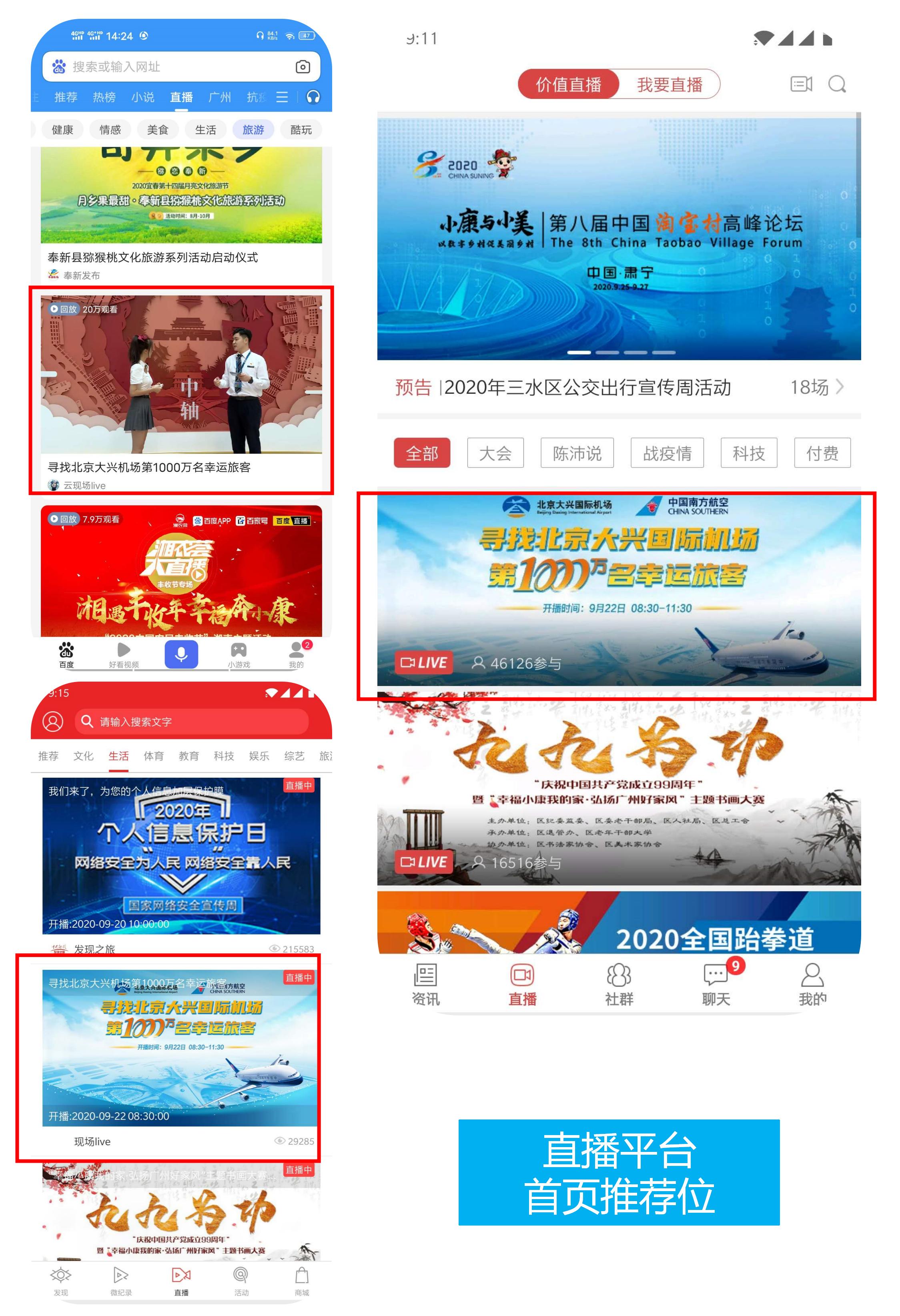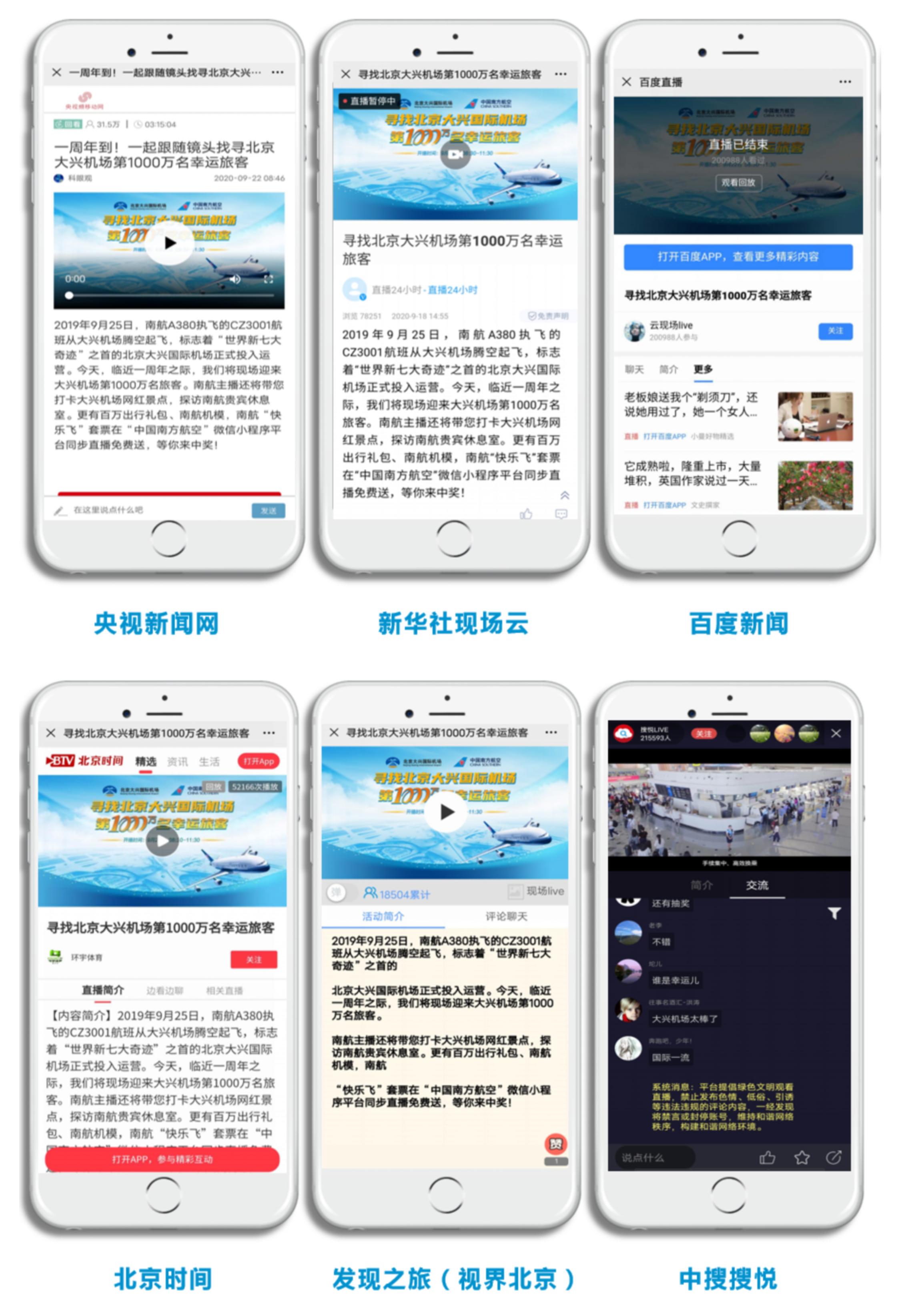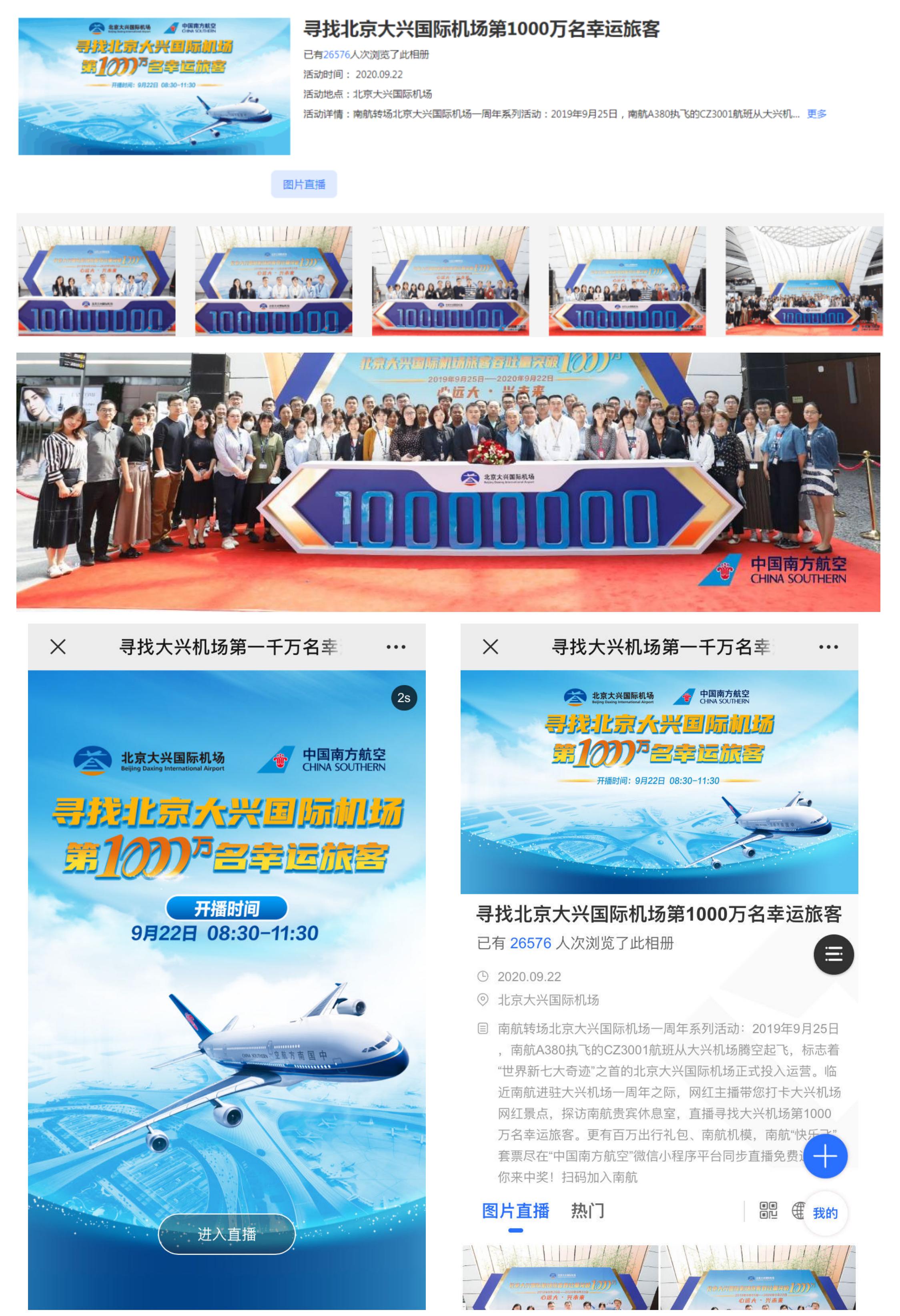 - ? 案例背景 : 南航轉(zhuǎn)場(chǎng)北京大興國(guó)際機(jī)場(chǎng)一周年系列活動(dòng):2019年9月25日,南航A380執(zhí)飛的CZ3001航班從大興機(jī)場(chǎng)騰空起飛,標(biāo)志著“世界新七大奇跡”之首的北京大興國(guó)際機(jī)場(chǎng)正式投入運(yùn)營(yíng)。 臨近南航進(jìn)駐大興機(jī)場(chǎng)一周年之際,網(wǎng)紅主播帶您打卡大興機(jī)場(chǎng)網(wǎng)紅景點(diǎn),探訪南航貴賓休息室,直播尋找大興機(jī)場(chǎng)第1000萬(wàn)名幸運(yùn)旅客。