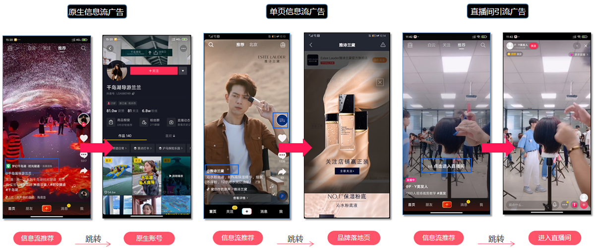 在信息流推薦內(nèi)容中,點(diǎn)擊頭像、昵稱、廣告組件等操作后,進(jìn)入品牌推廣落地頁(yè)