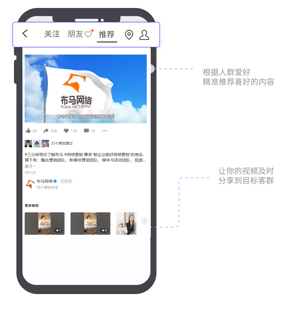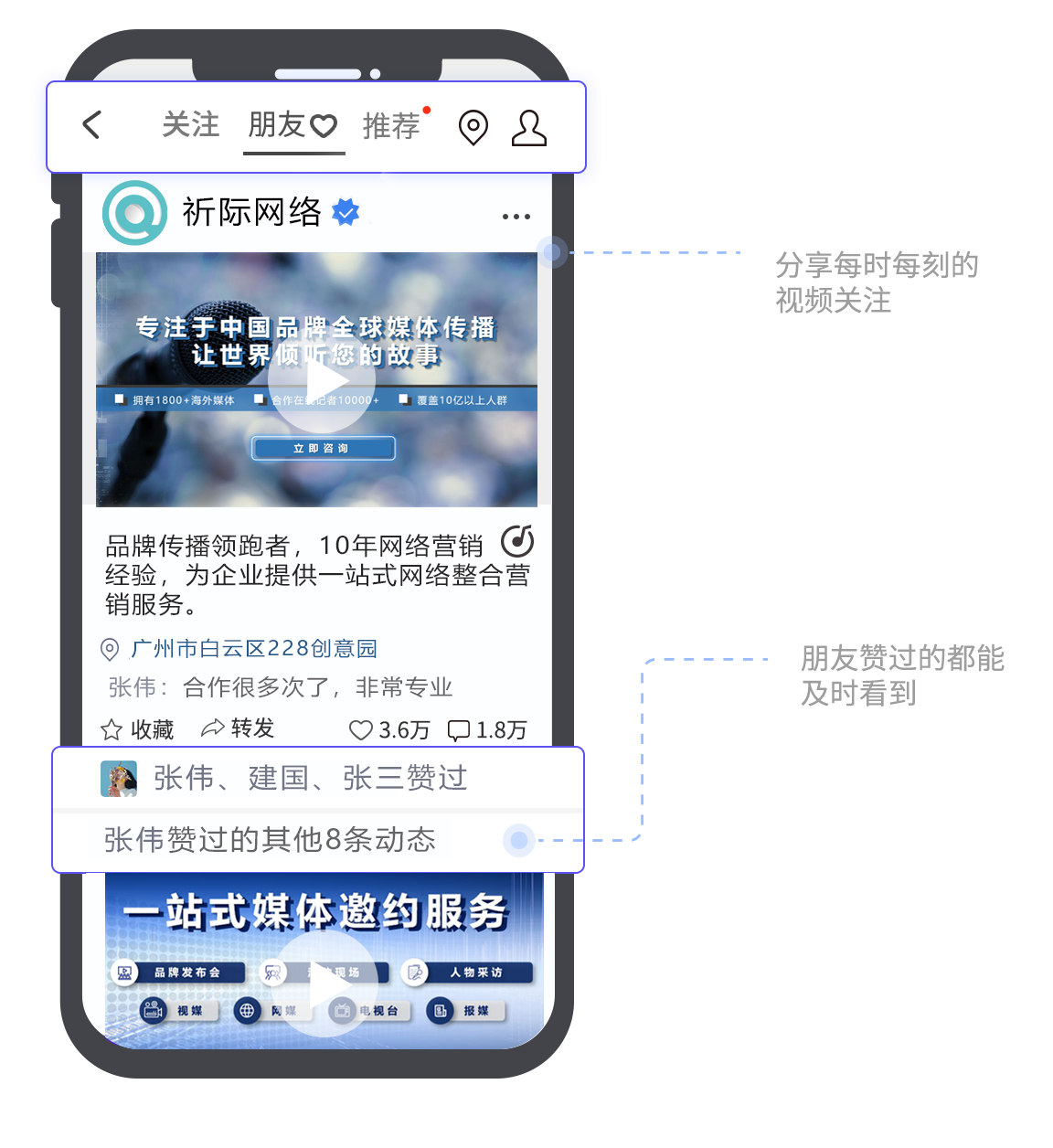 社交屬性:關(guān)注、朋友、推薦附近視頻、朋友推薦、站在c位